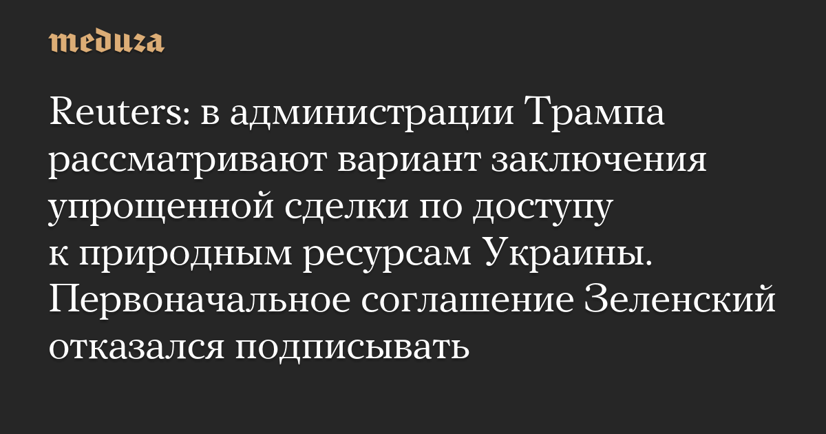 Reuters: в администрации Трампа рассматривают вариант заключения упрощенной сделки по доступу к природным ресурсам Украины. Первоначальное соглашение Зеленский отказался подписывать