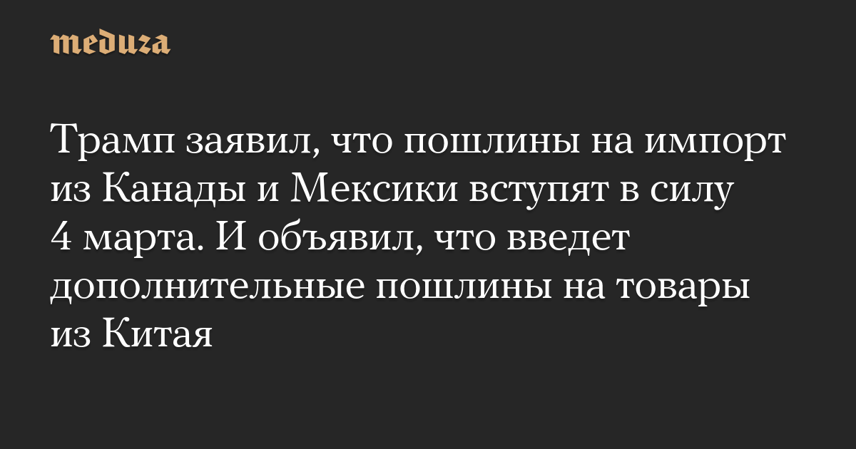 Трамп заявил, что пошлины на импорт из Канады и Мексики вступят в силу 4 марта. И объявил, что введет дополнительные пошлины на товары из Китая