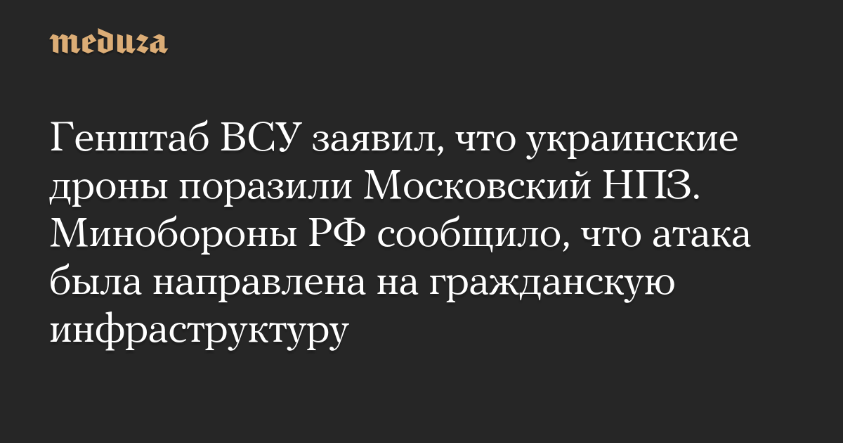 Генштаб ВСУ заявил, что украинские дроны поразили Московский НПЗ. Минобороны РФ сообщило, что атака была направлена на гражданскую инфраструктуру
