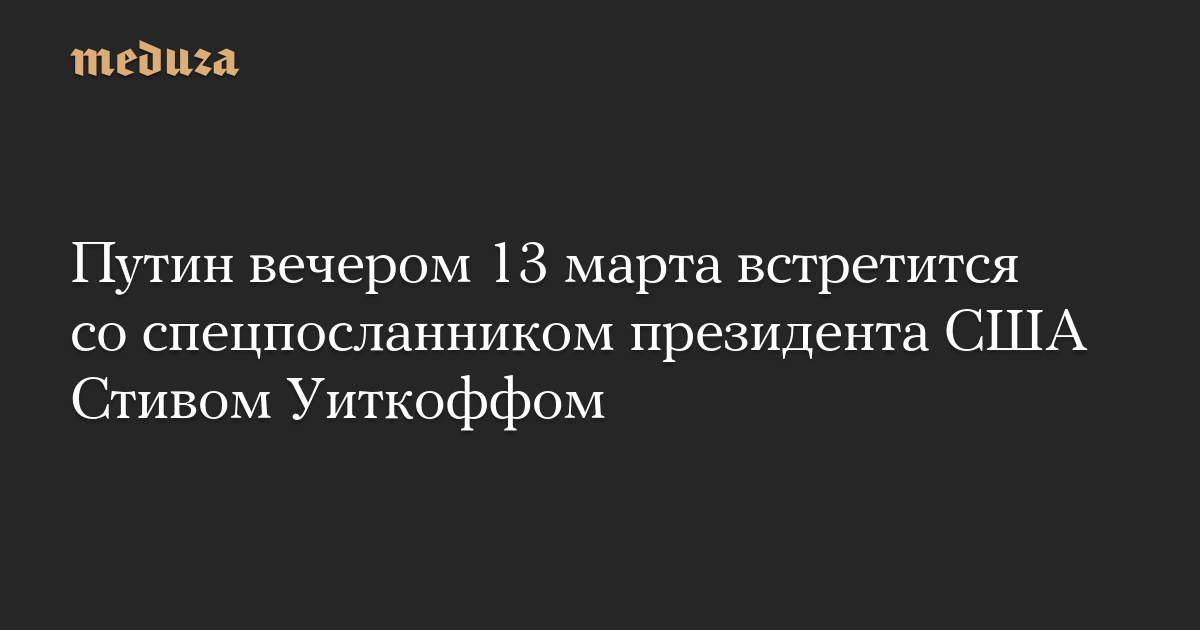 Владимир Путин вечером 13 марта проведет переговоры со спецпредставителем президента США Дональда Трампа по Ближнему Востоку Стивом Уиткоффом, сообщил специальный корреспондент «Коммерсанта» Андрей Колесников (входит в кремлевский пул).