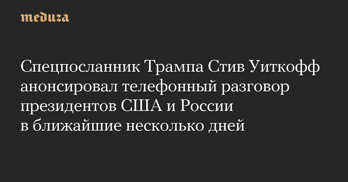 Специальный посланник президента США Стив Уиткофф сообщил, что в ближайшие несколько дней может состояться телефонный разговор между Дональдом Трампом и президентом РФ Владимиром Путиным. В интервью CNN Уиткофф сказал, что президенты, вероятно, созвонятся «на неделе» с 17 по 23 марта.