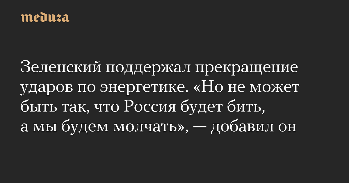 Зеленский поддержал прекращение ударов по энергетике. «Но не может быть так, что Россия будет бить, а мы будем молчать», — добавил он
