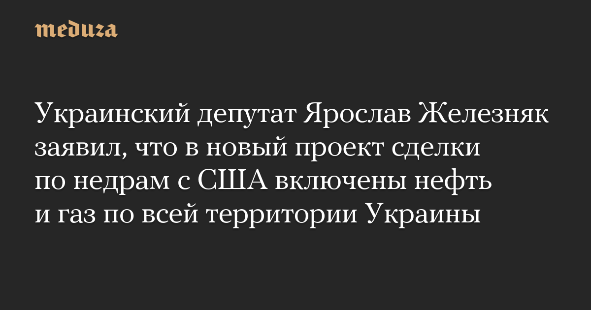 Новый проект соглашения о полезных ископаемых между Украиной и США включает нефть и газ по всей территории страны, заявил депутат Верховной рады Ярослав Железняк, ознакомившийся, как он утверждает, с документом.