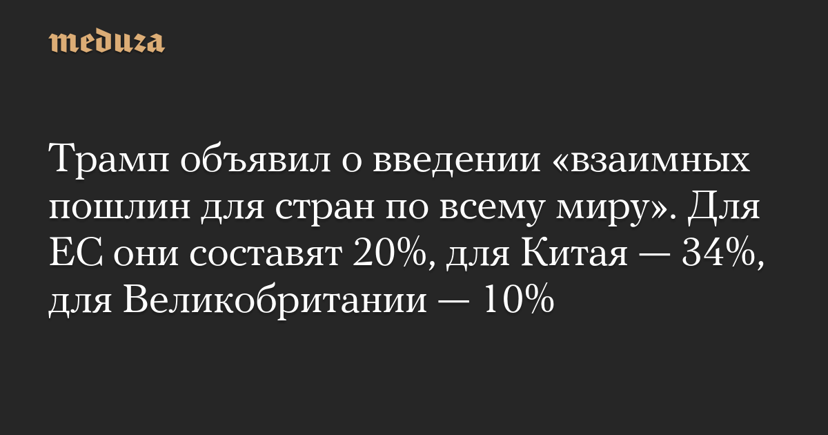 Трамп объявил о введении «взаимных пошлин для стран по всему миру». Для ЕС они составят 20%, для Китая — 34%, для Великобритании — 10%
