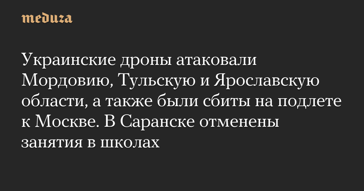 Украинские дроны атаковали Мордовию, Тульскую и Ярославскую области, а также были сбиты на подлете к Москве. В Саранске отменены занятия в школах
