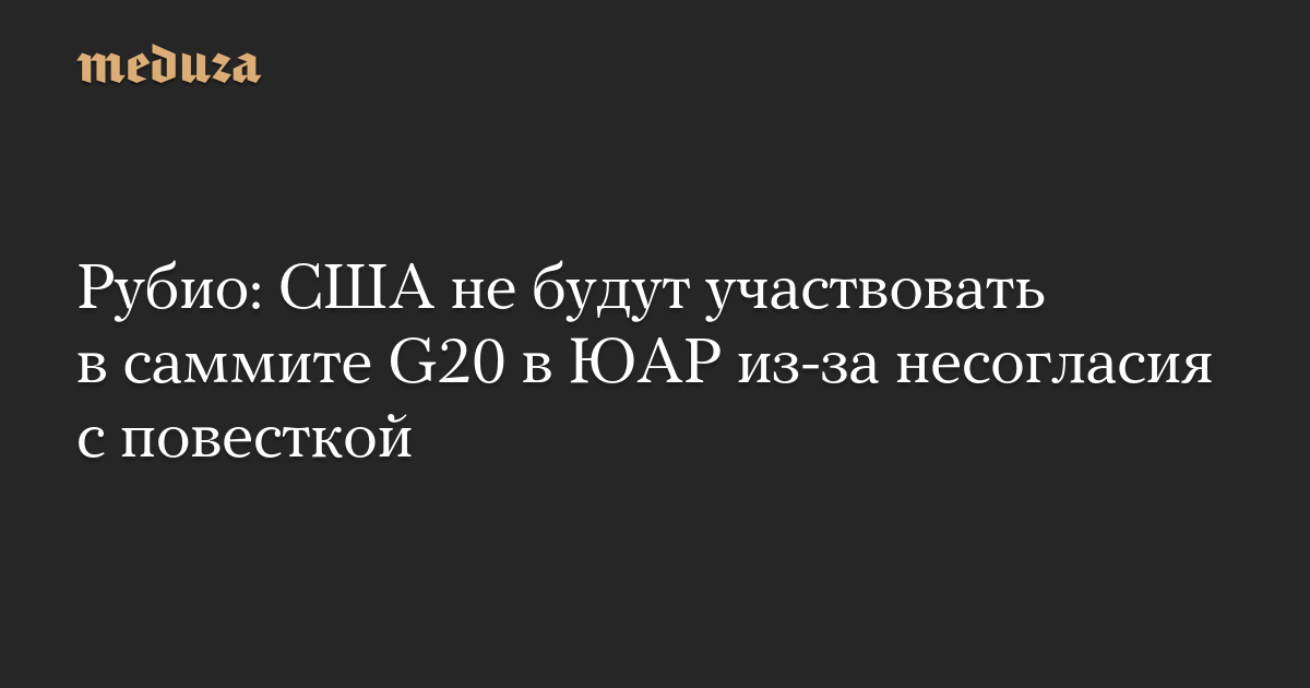 Рубио еще в начале февраля заявлял, что не поедет на саммит G20 в Йоханнесбурге. «ЮАР делает очень плохие вещи. Экспроприирует частную собственность. Использует G20 для продвижения „солидарности, равенства и устойчивости“. Другими словами: разнообразие, справедливость, инклюзивность (DEI) и изменение климата. Моя работа — продвигать национальные интересы Америки, а не тратить деньги налогоплательщиков или нянчиться с антиамериканизмом», — написал он.