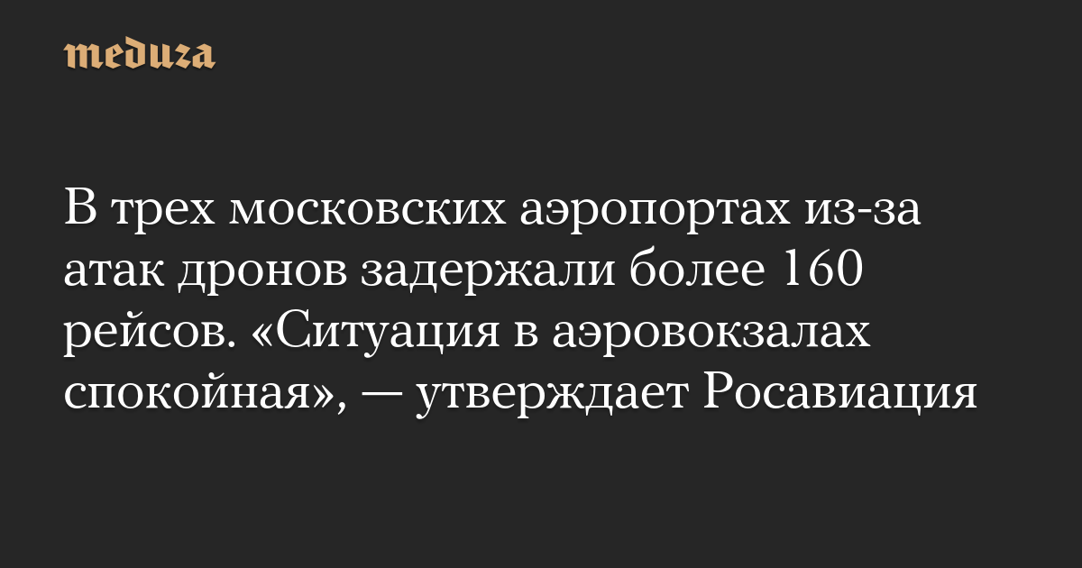 В трех московских аэропортах из-за атак дронов задержали более 160 рейсов. «Ситуация в аэровокзалах спокойная», — утверждает Росавиация