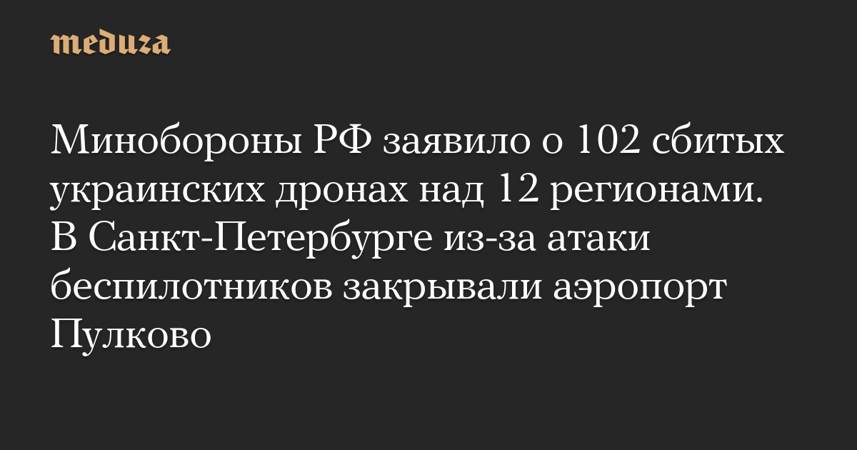 Минобороны РФ заявило о 102 сбитых украинских дронах над 12 регионами. В Санкт-Петербурге из-за атаки беспилотников закрывали аэропорт Пулково