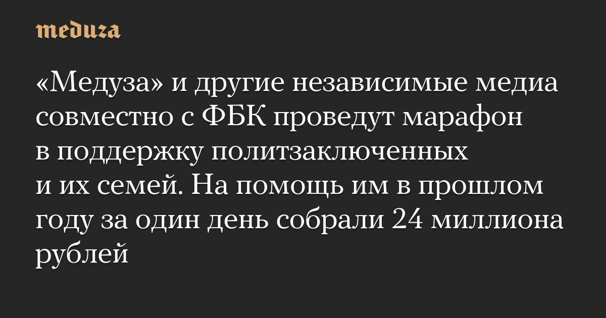 «Медуза» и другие независимые медиа совместно с ФБК проведут марафон в поддержку политзаключенных и их семей. На помощь им в прошлом году за один день собрали 24 миллиона рублей