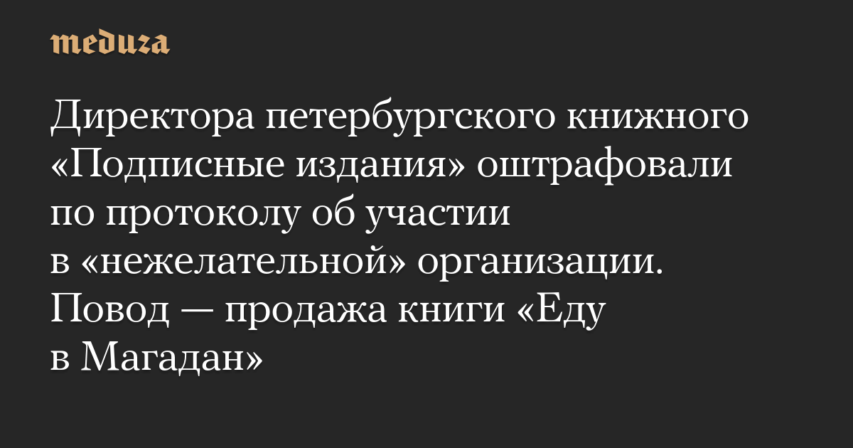 Директора петербургского книжного «Подписные издания» оштрафовали по протоколу об участии в «нежелательной» организации. Повод — продажа книги «Еду в Магадан»
