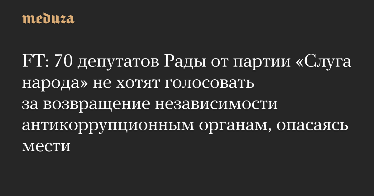 FT: 70 депутатов Рады от партии «Слуга народа» не хотят голосовать за возвращение независимости антикоррупционным органам, опасаясь мести