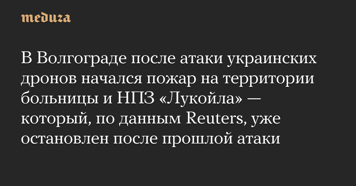 В Волгограде после атаки украинских дронов начался пожар на территории больницы и НПЗ «Лукойла» — который, по данным Reuters, уже остановлен после прошлой атаки
