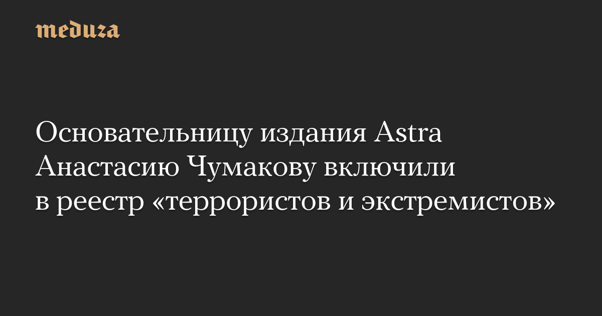 Росфинмониторинг включил в реестр «террористов и экстремистов» 49 человек, в их числе основательница и главный редактор издания Astra Анастасия Чумакова, отмечает телеграм-канал, отслеживающий обновления списка.