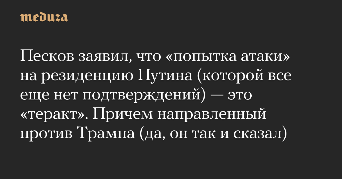 Песков заявил, что «попытка атаки» на резиденцию Путина (которой все еще нет подтверждений) — это «теракт». Причем направленный против Трампа (да, он так и сказал)