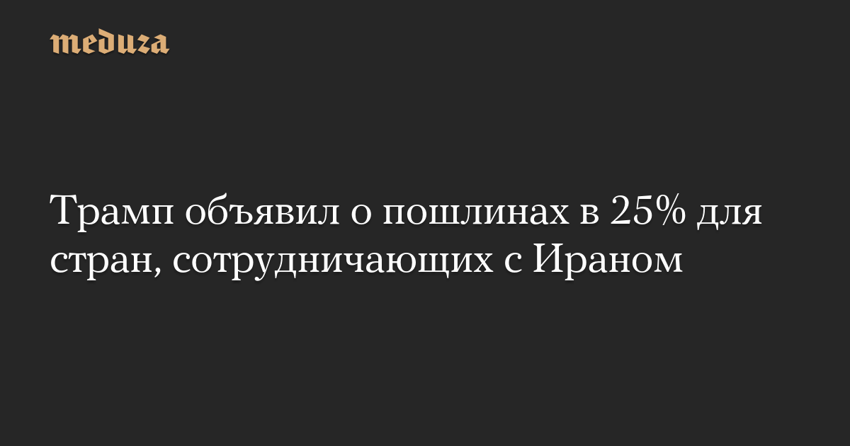США вводят пошлины в размере 25% в отношении стран, которые ведут бизнес с Ираном, сообщил президент Дональд Трамп в соцсети Truth Social.