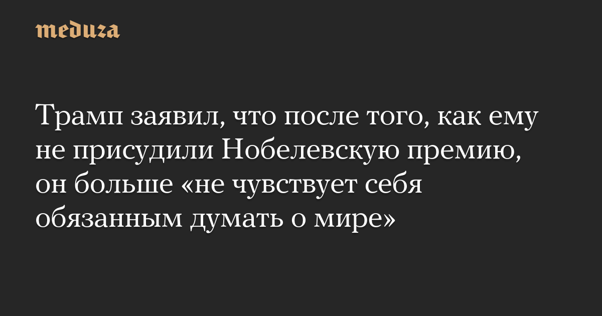 Трамп заявил, что после того, как ему не присудили Нобелевскую премию, он больше «не чувствует себя обязанным думать о мире»