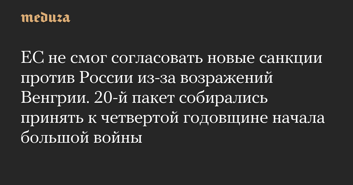 ЕС не смог согласовать новые санкции против России из-за возражений Венгрии. 20-й пакет собирались принять к четвертой годовщине начала большой войны