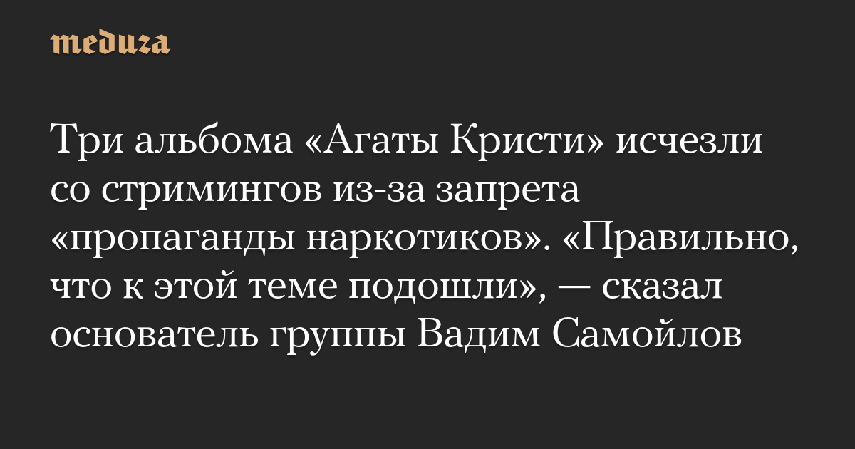 Три альбома «Агаты Кристи» исчезли со стримингов из-за запрета «пропаганды наркотиков». «Правильно, что к этой теме подошли», — сказал основатель группы Вадим Самойлов