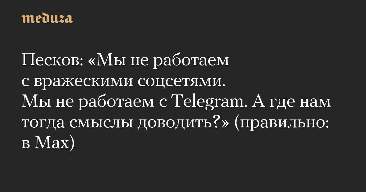 Песков: «Мы не работаем с вражескими соцсетями. Мы не работаем с Telegram. А где нам тогда смыслы доводить?» (правильно: в Max)