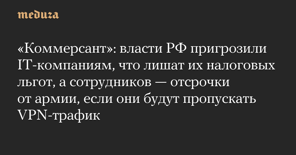 «Коммерсант»: власти РФ пригрозили IT-компаниям, что лишат их налоговых льгот, а сотрудников — отсрочки от армии, если они будут пропускать VPN-трафик
