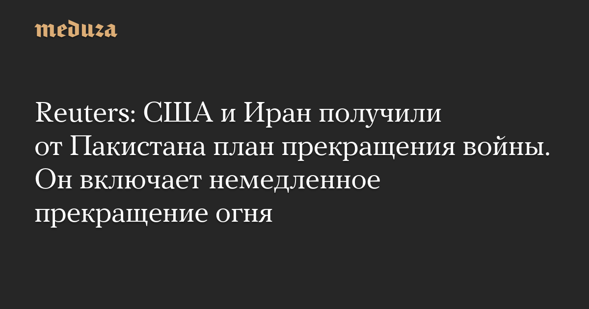 Reuters: США и Иран получили от Пакистана план прекращения войны. Он включает немедленное прекращение огня