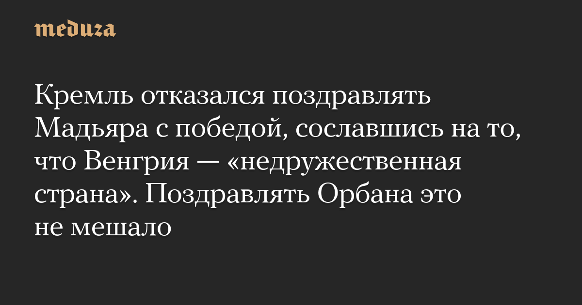 Кремль отказался поздравлять Мадьяра с победой, сославшись на то, что Венгрия — «недружественная страна». Поздравлять Орбана это не мешало