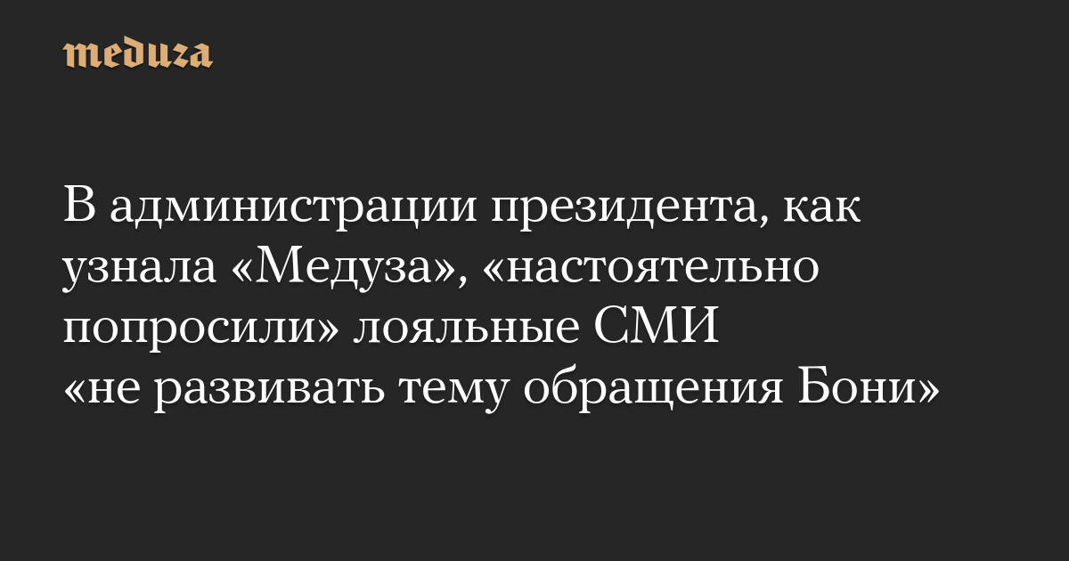 Источник «Медузы» в одном из лояльных российской власти СМИ сообщил, что от политического блока администрации президента поступила «настоятельная просьба» «не развивать тему обращения Бони».