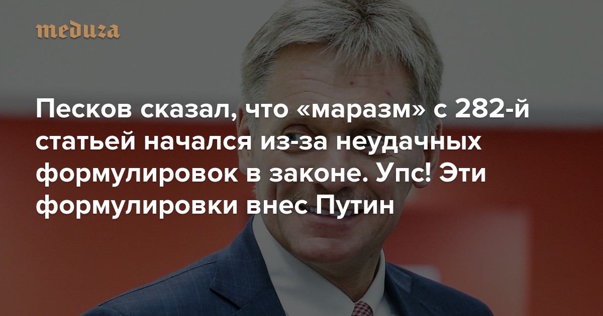 Песков сказал, что «маразм» с 282-й статьей начался из-за неудачных формулировок в законе. Упс! Эти формулировки внес Путин