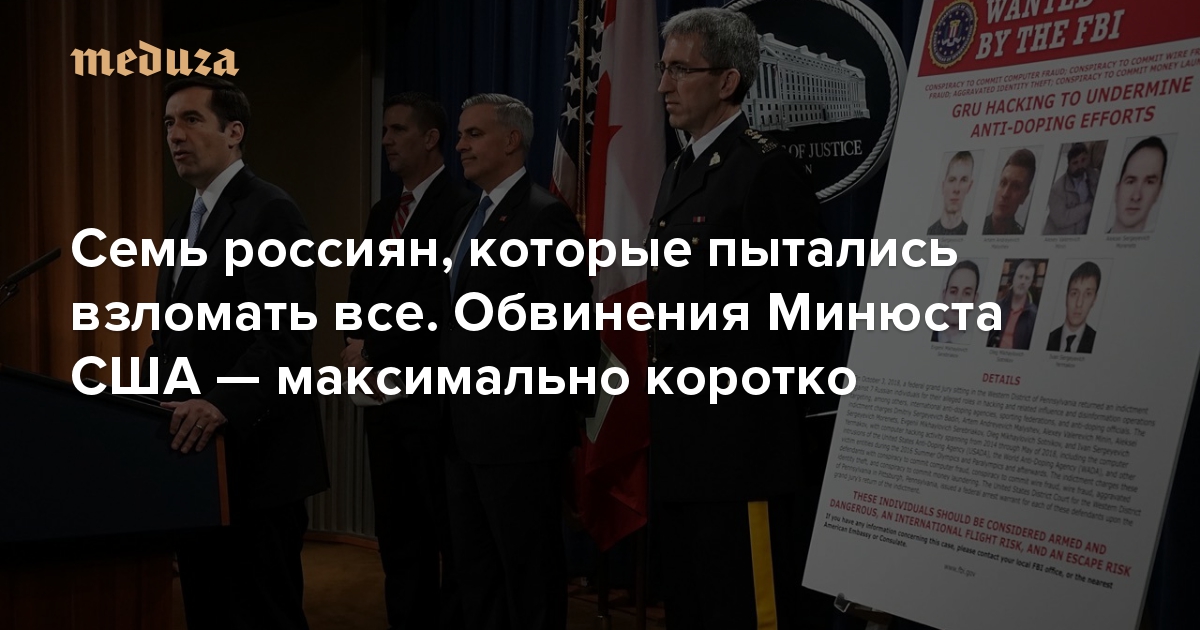 Алексей Моренец, Евгений Серебряков, Иван Ермаков, Артем Малышев, Дмитрий Бадин, Олег Сотников, Алексей Минин — вот семь хакеров, которые обвиняются в нарушении закона. Они работали на ГРУ и либо взломали, либо пытались взломать антидопинговые агентства, Международную ассоциацию легкоатлетических федераций, ФИФА, ОЗХО, компанию, управляющую одной из американских АЭС — и многое другое; это была целая серия хакерских атак. Часть полученных материалов, в том числе персональная информация спортсменов, публиковалась от лица хакерской группировки Fancy Bears — чтобы склонить общественное мнение в пользу России в допинговом скандале.