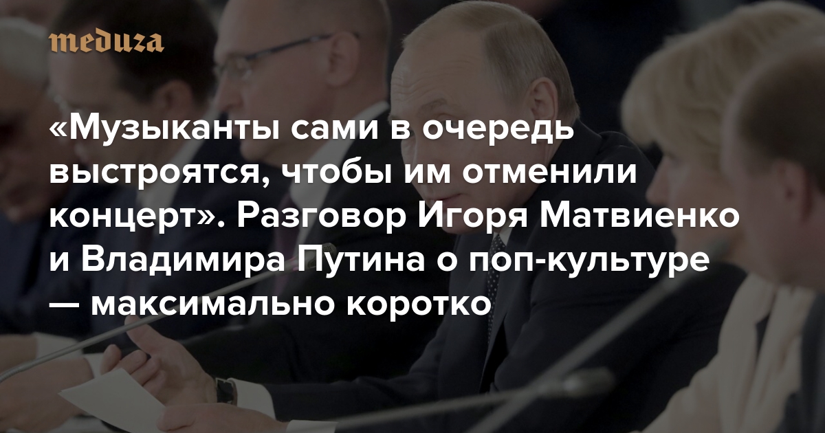 Разговор состоялся на заседании совета при президенте РФ по культуре в Санкт-Петербурге. Продюсер Игорь Матвиенко, известный работой с «Любэ» и «Иванушками International», входит в этот совет. Дословные цитаты приведены в кавычках, остальной текст — пересказ разговора.
