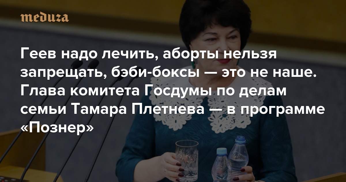 Геев надо лечить, аборты нельзя запрещать, бэби-боксы — это не наше. Глава комитета Госдумы по делам семьи Тамара Плетнева — в программе «Познер»