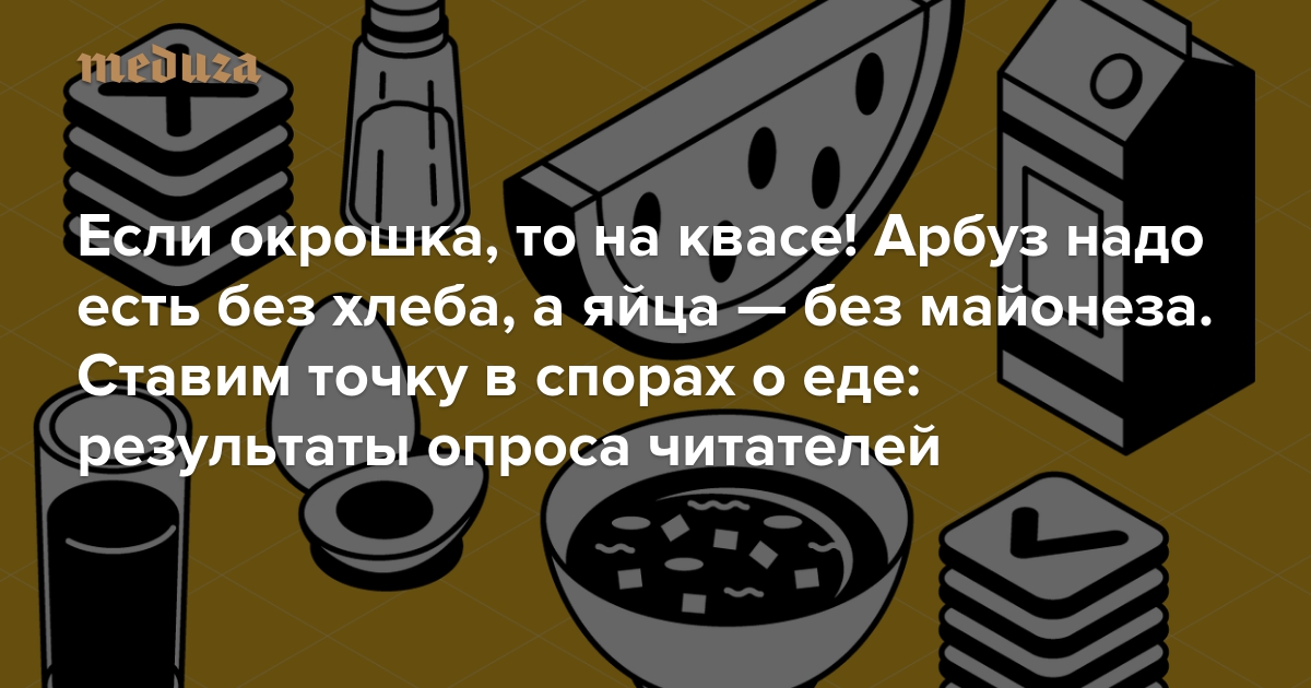 «Медуза» попросила читателей поставить точку в спорах о еде. Так вот, окрошку надо готовить на квасе. Но только если вы живете не на Северном Кавказе! Там большинство добавляют в окрошку кефир. Макароны с хлебом едят 17% читателей, 11% заедают хлебом арбуз. Главная битва — между сторонниками и противниками молочного супа с вермишелью. 43% считают, что это ужасно вкусно, остальные — что просто ужасно. Хуже всех к молочному супу относятся те, кто не живет в России. Холодец лучше есть с хреном, а яйца без майонеза. В вареные пельмени (да, жареные проиграли!) лучше добавлять сметану. В крайнем случае можно добавить кетчуп или майонез. Сырный соус — почти никогда. Добавлять ананас в несладкое блюдо — это великолепно.