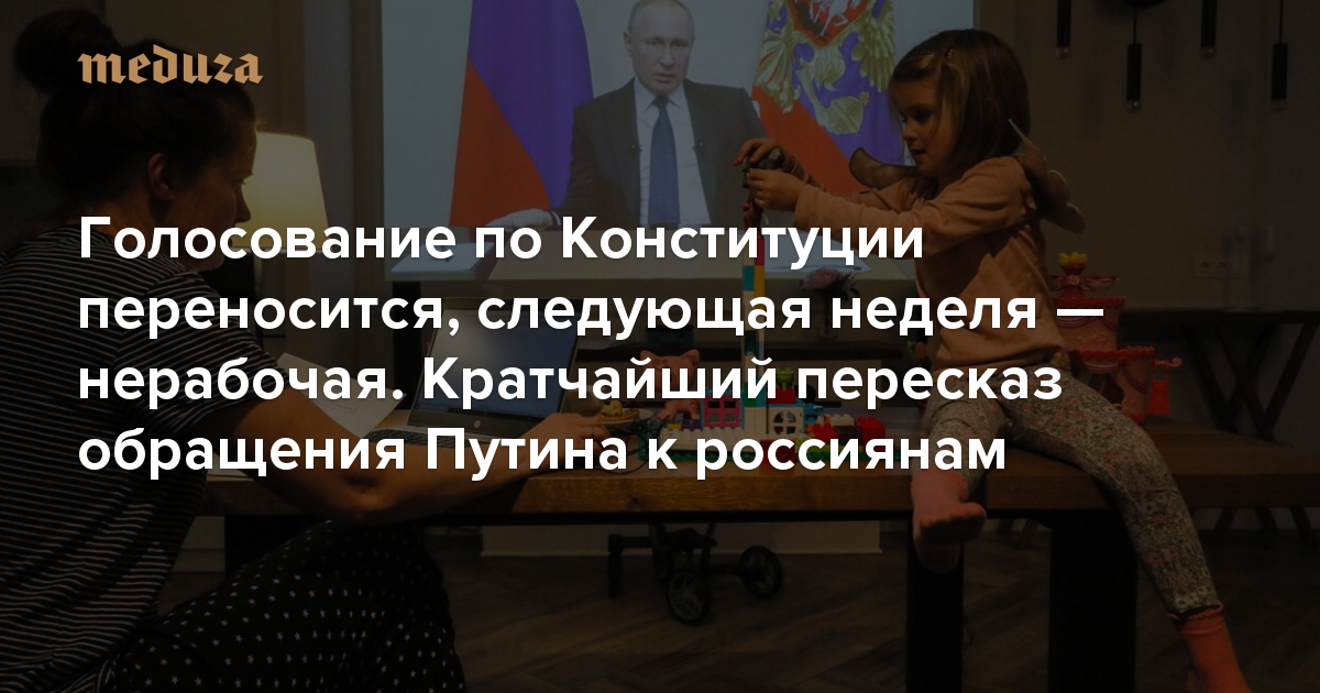 Голосование по Конституции переносится, следующая неделя — нерабочая. Кратчайший пересказ обращения Путина к россиянам