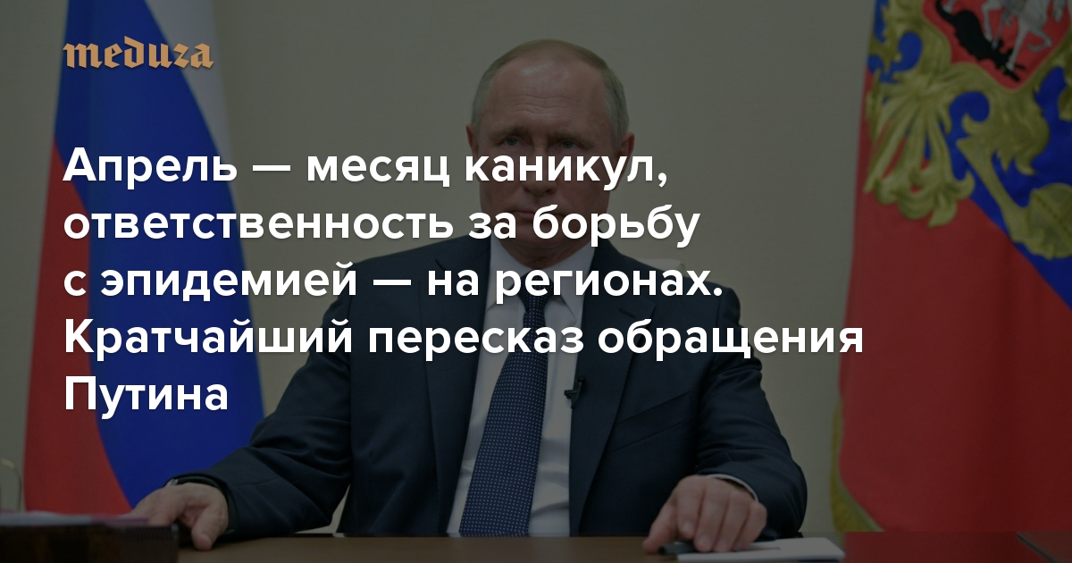 Апрель — месяц каникул, ответственность за борьбу с эпидемией — на регионах Кратчайший пересказ второго обращения Путина по поводу коронавируса