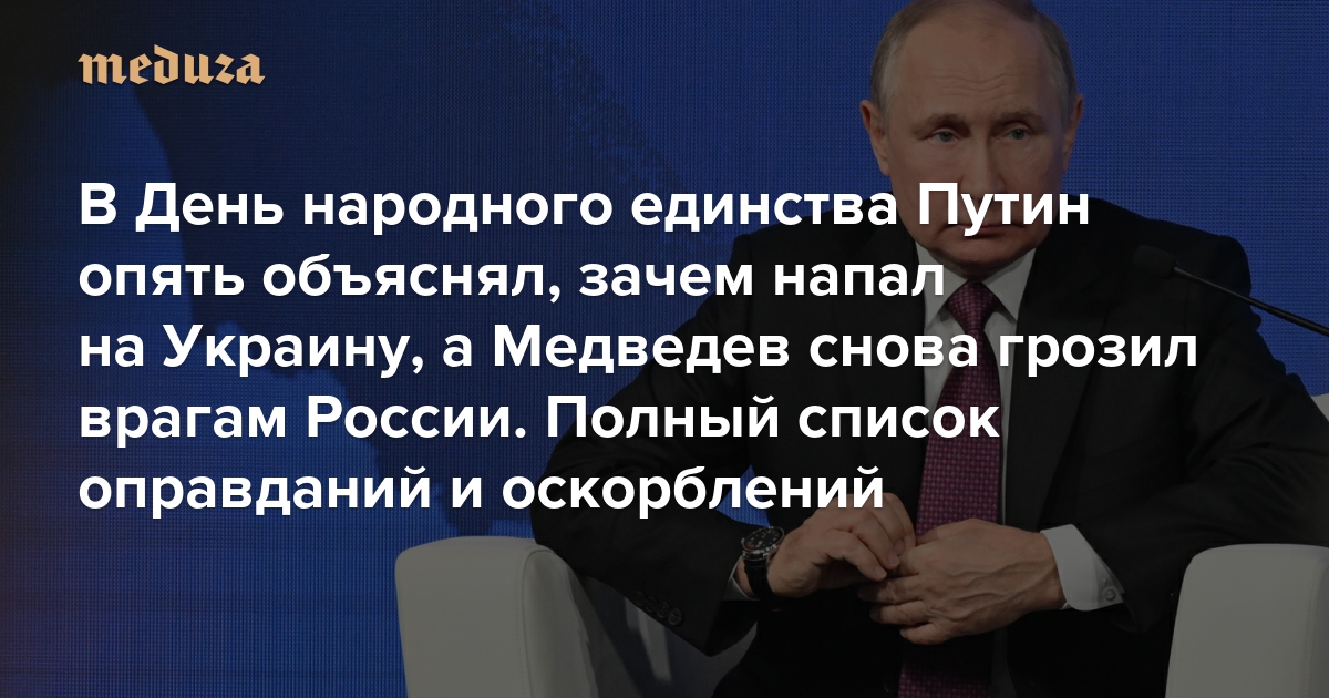 В День народного единства Путин опять объяснял, зачем напал на Украину, а Медведев снова грозил врагам России Полный список оправданий и оскорблений