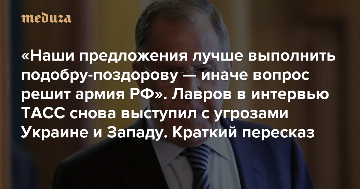 «Наши предложения лучше выполнить подобру-поздорову — иначе вопрос решит армия России» Лавров в интервью ТАСС снова выступил с угрозами Украине и Западу. Краткий пересказ