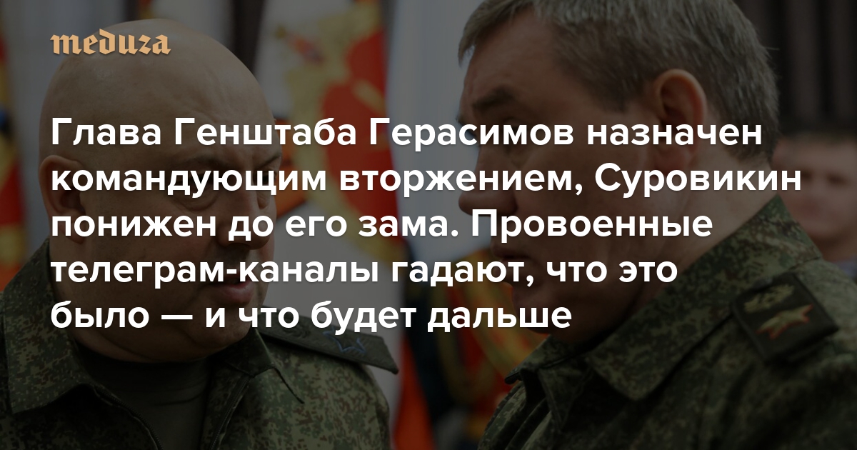 Глава Генштаба Герасимов назначен командующим вторжением, Суровикин понижен до его зама. Провоенные телеграм-каналы гадают, что это было — и что будет дальше Вот что они пишут. Максимально коротко