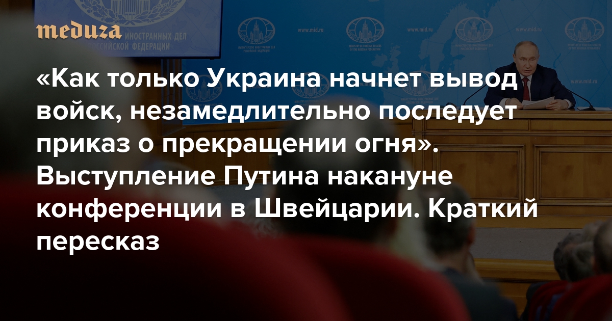 «Как только Украина начнет вывод войск, незамедлительно последует приказ о прекращении огня» Выступление Путина накануне конференции в Швейцарии. Краткий пересказ