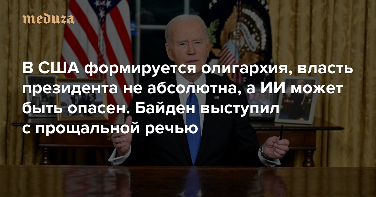 В США формируется олигархия, власть президента не абсолютна, а ИИ может быть опасен Байден выступил с прощальной речью (Украину он назвал «все еще свободной», а Россию не упомянул)