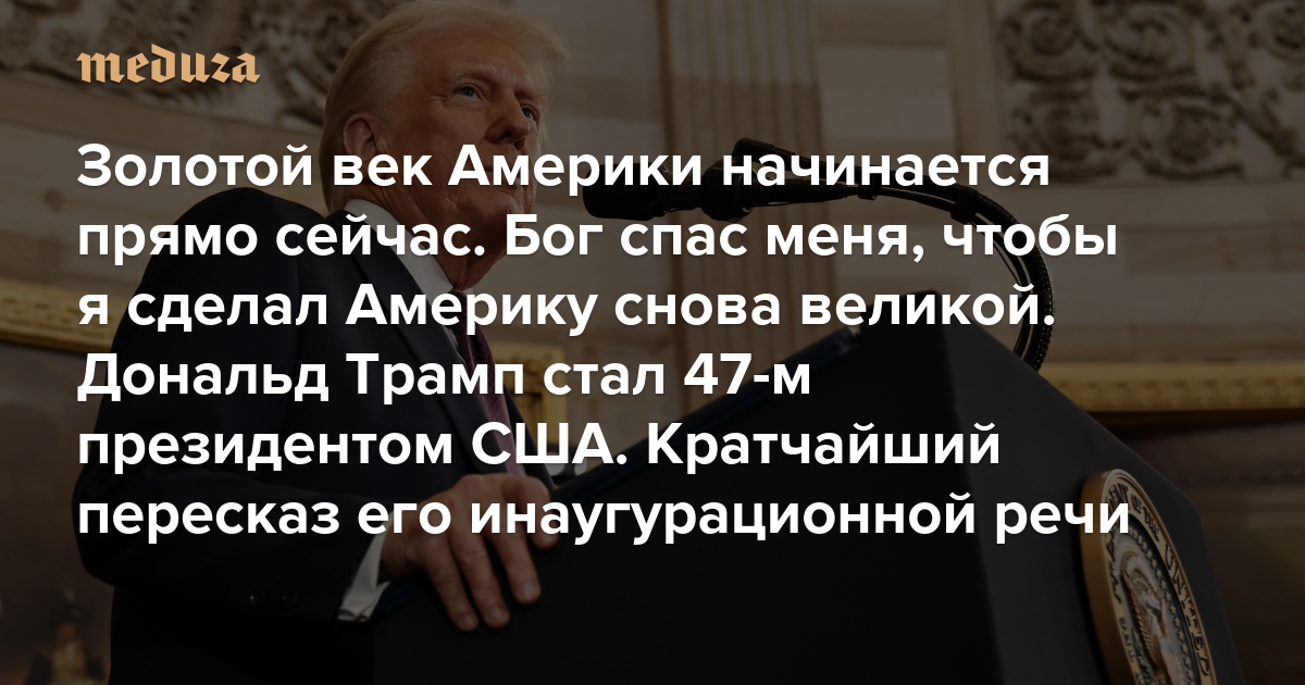 Золотой век Америки начинается прямо сейчас. Бог спас меня, чтобы я сделал Америку снова великой Дональд Трамп стал 47-м президентом США. Кратчайший пересказ его инаугурационной речи