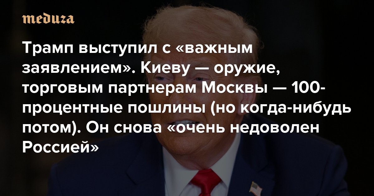 Трамп выступил с «важным заявлением». Киеву — оружие, торговым партнерам Москвы — 100-процентные пошлины (но когда-нибудь потом) Он снова «очень недоволен Россией» — и четыре раза думал, что заключил сделку с Путиным