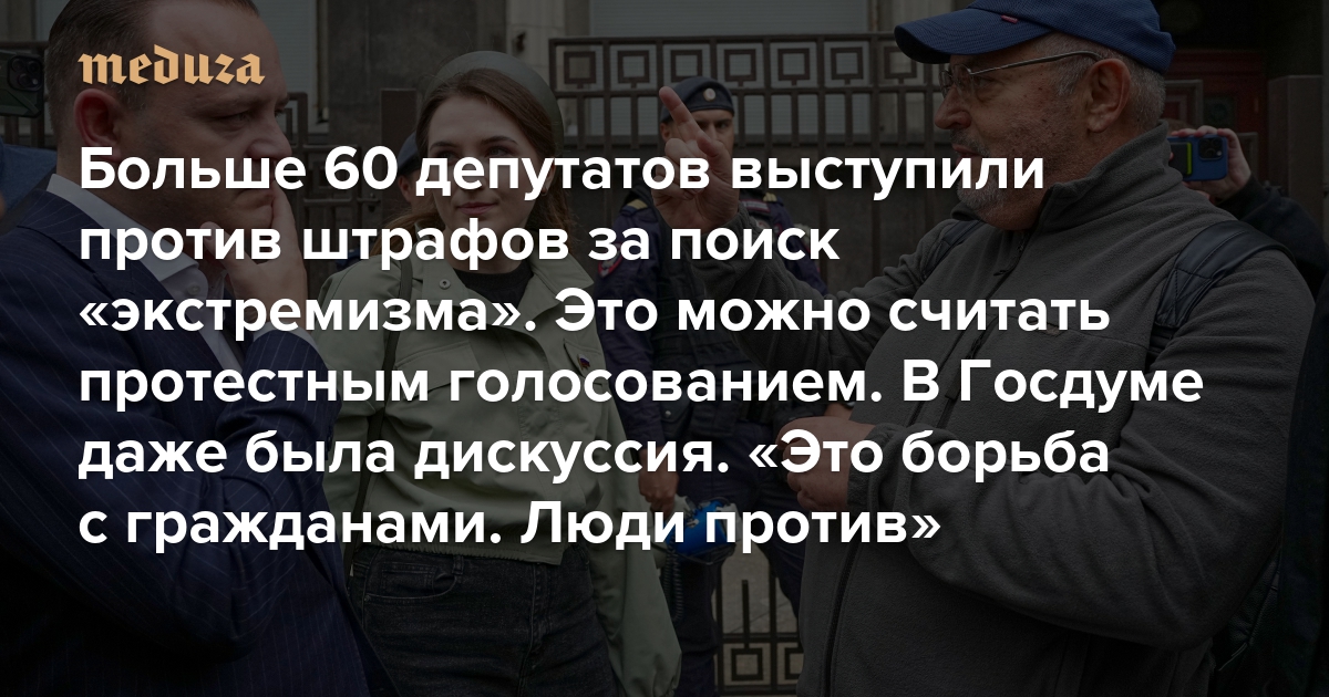 Больше 60 депутатов выступили против штрафов за поиск «экстремизма». Это можно считать протестным голосованием. В Госдуме даже была дискуссия «Это борьба с гражданами. Люди против»