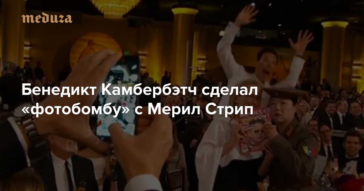 Британский актер Бенедикт Камбербэтч сделал «фотобомбу» с Мерил Стрип во время церемонии вручения «Золотого глобуса». Когда Майкл Китон фотографировал Мерил Стрип с Маргарет Чо в образе северокорейской журналистки, Камбербэтч выпрыгнул со своего места с поднятыми руками, чтобы попасть в кадр. Насколько можно судить по видеозаписи, на снимок Китона актер все-таки не попал, но мы не можем не отметить эту попытку признанного мастера фотобомбы.