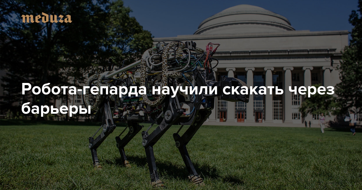 Инженеры из Массачусетского технологического института научили робота-гепарда перепрыгивать препятствия с разбега. Робот перепрыгивает барьеры до 45 сантиметров в высоту в 90 процентах случаев.