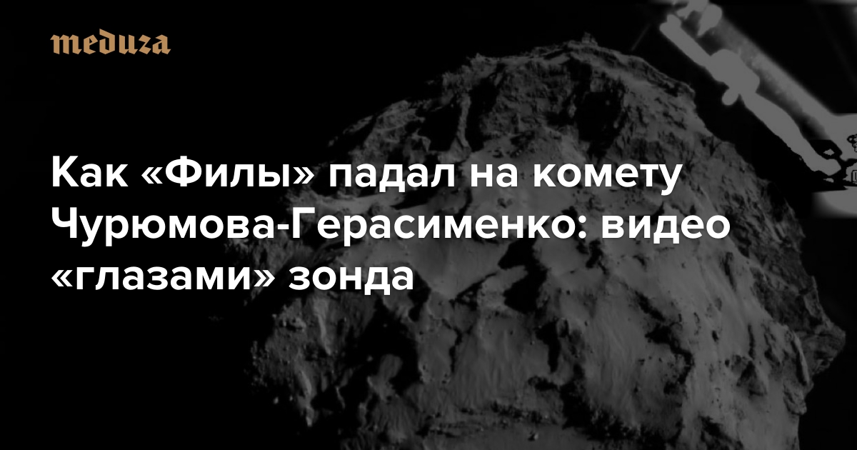Европейское космическое агентство опубликовало видео, в котором воссоздано падение зонда «Филы» на комету Чурюмова-Герасименко глазами самого аппарата. Ролик склеен из фотографий, сделанных зондом в ноябре 2014 года, когда он направился к поверхности кометы.