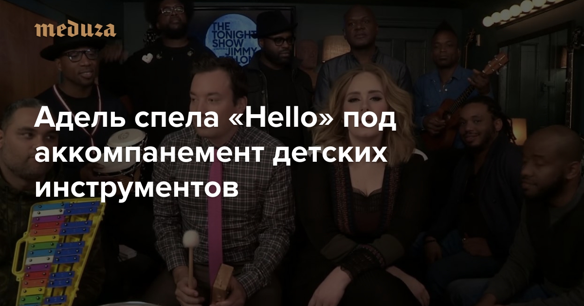 Певица Адель исполнила свой новый хит «Hello» на шоу The Tonight Show Джимми Фэллона. Но песня прозвучала не совсем в классическом виде: музыку Фэллон и группа The Roots исполняли на детских инструментах. Самой Адель достался игрушечный телефон-раскладушка.