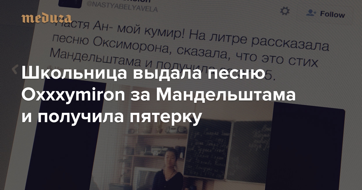 Школьница из Хабаровского края прочитала текст песни «Переплетено» российского рэпера Oxxxymiron, выдав его за стихотворение Осипа Мандельштама. Как утверждает издание HLEB, учитель не заметила подмену и поставила ученице 11 класса пятерку.
