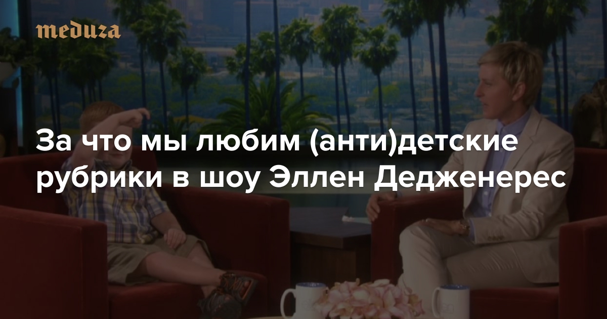 Из нашей подборки может показаться, что Дедженерес на самом деле не любит детей. Но это не так. Дети — частые гости в ее шоу. Они танцуют, поют и рассказывают о себе. Вот, к примеру, Джейкоб Тремблэ, сыгравший в фильме «Комната», рассказывает о встрече с Леонардо Ди Каприо перед вручением «Оскара»: «Я пожелал удачи ему, а он пожелал удачи мне. И он выиграл. А я — нет. Так что если вы хотите выиграть, обращайтесь ко мне».