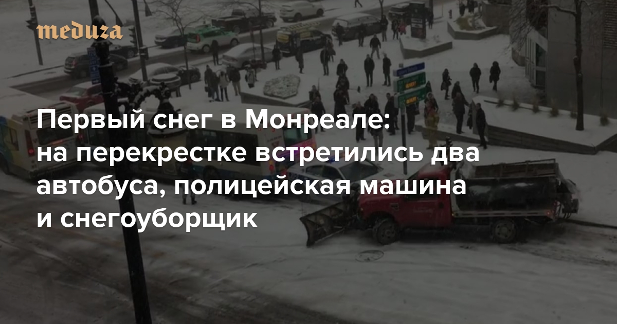 Первый снег в Монреале: на перекрестке встретились два автобуса, полицейская машина и снегоуборщик