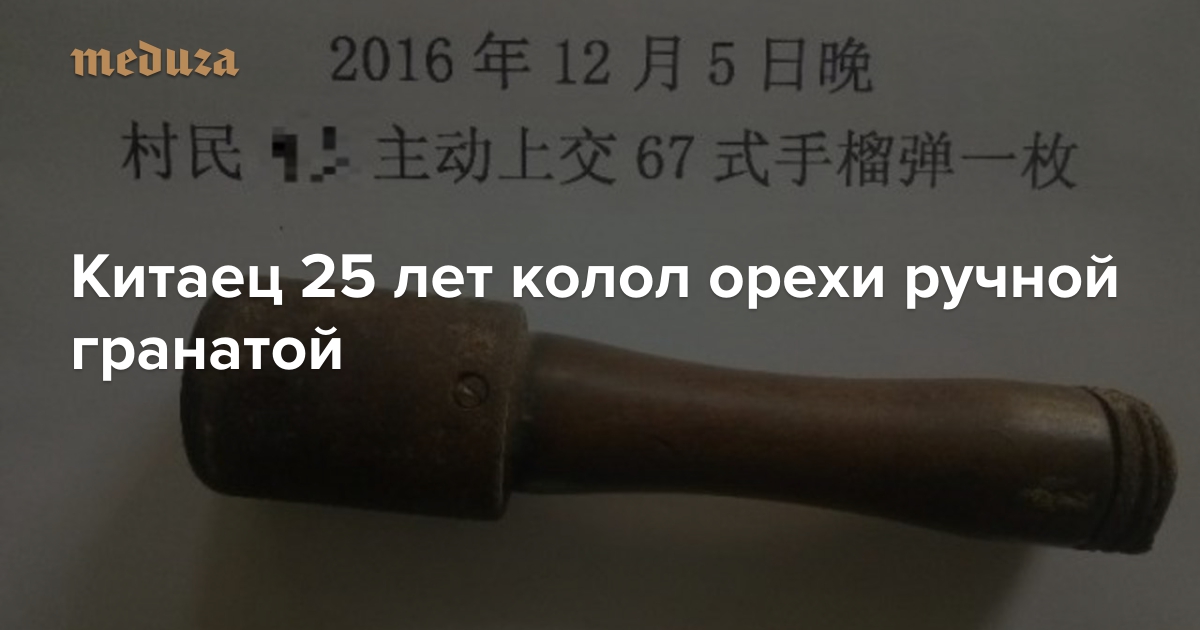 По словам мужчины по фамилии Жань, граната оказалась у него в 1991 году. Он не знал, что это, и на протяжении 25 лет колол гранатой грецкие орехи. Как рассказал Жань, ему показалось, что непонятная металлическая штуковина хорошо подходит для этого.